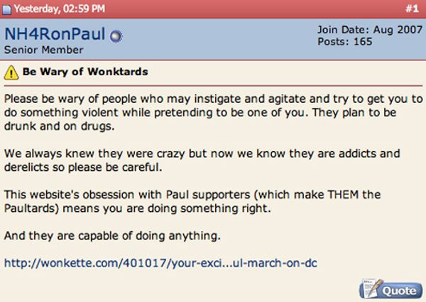 The Paultards are onto us, the "addicts and derelicts." We were only planning on going to the March drunk, not on drugs, although that sounds like a pretty good idea now that they've mentioned it. Anyway, we'll have details for our 9 a.m. Saturday Paultardpalooza Pre-gaming by the end of the afternoon. If you're interested in coming (most likely to a bar around Capitol Hill), please send an e-mail to tips@wonkette.com, with subject line "HOT NAKED FLAPPERS." We just want to get a basic headcount. [ Ron Paul Forums ]