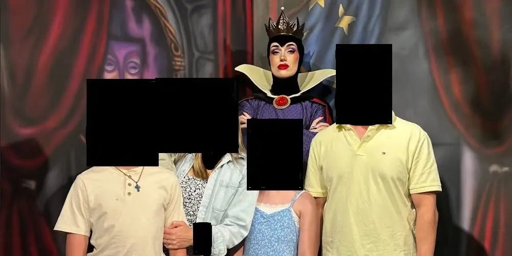 For the most part the manager just listened and never once apologized for anything. At one point the manager stated “I can assure you that she is a woman.” She went even further, trying to shame me, informing me that “she” was so excited to get the part as the Evil Queen. For a brief moment I thought “oh… maybe I’m wrong” but then I realized that I was just being gaslighted. I politely told the manager that “I know what you are doing and that I do not appreciate the fact that you are trying to be funny and disingenuous.” So since the manager doubled down I also doubled down and asked “is the Evil Queen a biological male?” The manager’s reply was, “I’m sorry sir, I cannot answer that.”