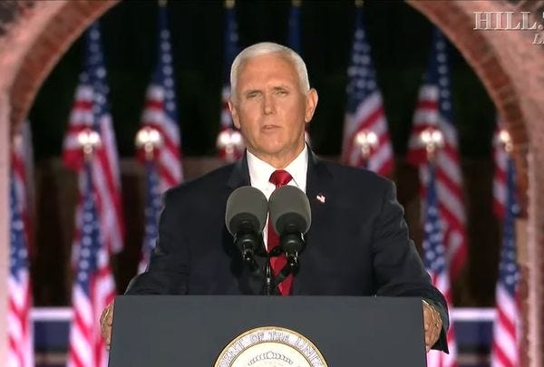 Vice President Mike Pence formally accepted the Republican nomination for a second term last night, so it's starting to look like there's only a 50-50 chance Trump will replace him with Nikki Haley. But pundits can always dream. In a bullshit-filled speech at Fort McHenry, one of the airports George Washington liberated during the Civil War, Pence delivered a speech that amounted to a 35-minute version of one of the tongue baths Pence gives Donald Trump at the beginning of every Cabinet meeting. The message was pretty simple: Donald Trump has done the best job of presidenting in human history, and Joe Biden will burn your home down, so Trump deserves at least four more years.