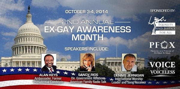 The line-up of activities includes a breakfast with libido killer Alan Keyes, the bestowing of something called the Friend of Ex-Gays Freedom Award on wingnut yapper Sandy Rios, and a screening of the documentary “Sing Over Me,” the “gritty yet beautiful, gut-wrenching while hopeful” documentary about Dennis Jernigan, a man whose faith in God helped him to overcome his gayness. For as Jesus said in some proverb or other, “Thou mayest follow Me, whomever you are: the beggar, the infirm, the afflicted. But no homo.”