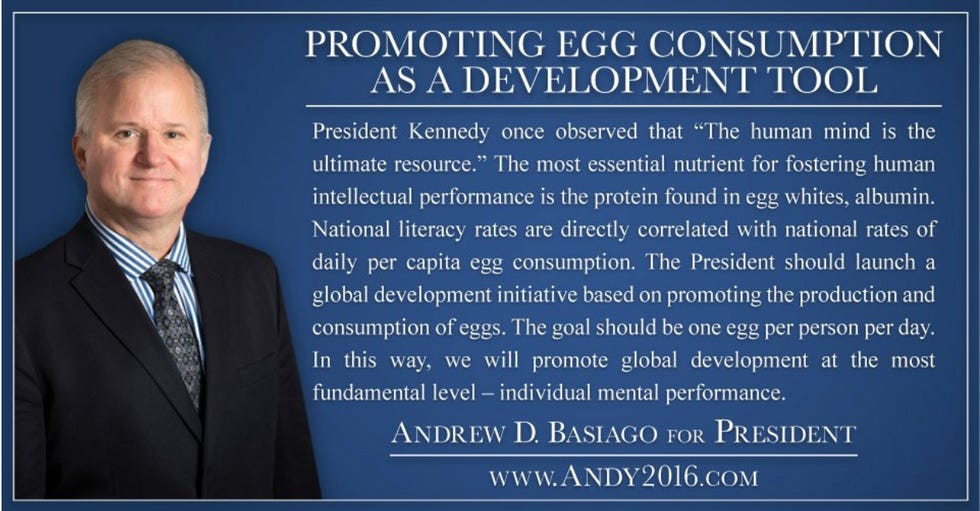 If President, Basiago will promote a program requiring everyone in the United States to eat at least one egg a day.