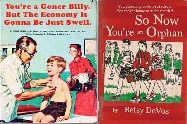 It came as a "surprise" to TrumpWorld and assorted wingnuts when Twitter and Facebook both pulled videos of the clip that had been posted to their platforms, because Jesus Christ on a moped with one bad tire, while it's true that kids may be less susceptible to, and less badly affected by COVID-19, they are not "immune" in any sense of the word: Children can get the virus, transmit the virus, get sick from the virus, and suffer lifelong damage or die from the virus.
