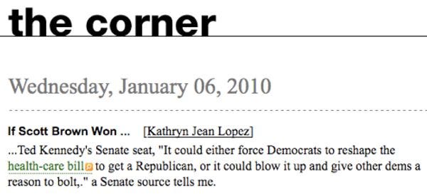 Uh oh, constipated dingbat Kathryn Jean Lopez of the National Review 's Corner -- the #1 Internet blog -- has been talking to her sources again. K-Lo generally has the best sources this side of Seymour Hersh, so obviously we are going to learn something: apparently if a Republican wins the Massachusetts special Senate election, the number of Democratic senators could potentiallyde-creasefrom "60" to something called "59," or "Fifty-nine." The source adds that this would causepolitical legislative problemsfor the Democrats, as a count of "60" votes is considered preferable to the "59" thing, insiders suggest. [ The Corner ]