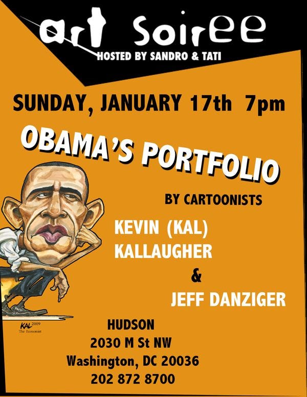 Sunday, January 17: One year ago, our savior, President Obama, was sworn into office. Editorial and political cartoonists have spent the majority of the past year making fun of him/presenting thoughtful analysis of his presidency through cartoons. The restaurant Hudson is hosting an exhibit of said cartoons this Sunday at 7PM. [Obama's Portfolio ]