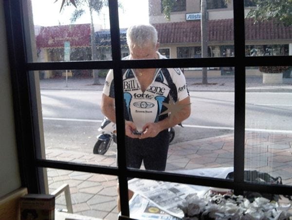 Wonkette "The View From Your Window" operative "UFgatorzfan4life" sends us this PG-13 erotica telephone picture of pedophile Mark Foley and writes, "Here is your favorite disgraced Congressman from Palm Beach County. He's hanging out at Starbucks..texting..riding his bike with his shirt unzipped. You know, normal disgraced Congressman activities. I see him about once a month here." HEY OPERATIVE: Next month when you see Mark Foley half-naked in spandex discreetly texting on an empty street,you must find a way to steal that phone.It is a public safety issue, for children.