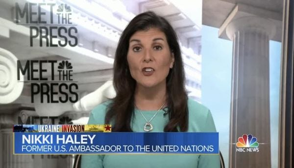 Speaking of Russia's invasion of Ukraine, Haley tried to sound tough by outlining steps the Biden Administration should be taking to oppose Vladimir Putin (much which they are already doing) like providing weapons and sanctions. But Haley, like most Republicans, believes if she just keeps saying Donald Trump was tough on Putin, people will be tricked into believing it.