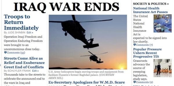 Some liberal group of liberals produced a fake edition of theNew York Timesrevealing all the wonderful things that will happen once hippies rule the world, next July. The evil corporate Harvard Business School will close forever; George Bush will be tried for war crimes; and the Patriot Act will be repealed by a 99-1 vote, with only a drunken Jon Kyl dissenting. Jesus, reading this thing is like crawling in Medea Benjamin'sbrain.Come join us in a tour of this bleeding-heart masturbation pamphlet.