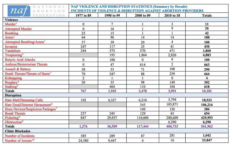 The problem with that is, while the anti-choice crowd has killed lots and lots of people and bombed lots and lots of buildings, the pro-choice side has not done any of that. At all. For any reason.