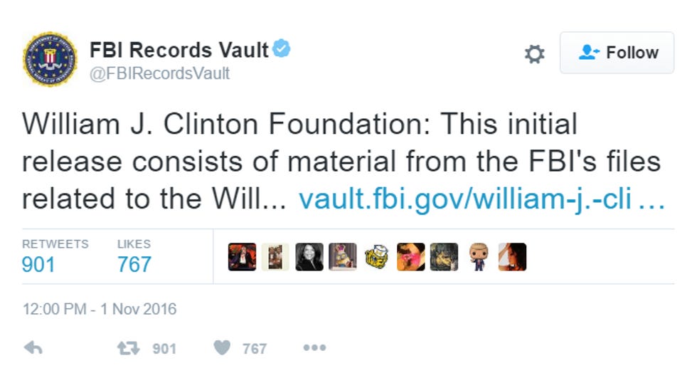 So the official word is that the Twitter account just happened to burp out a whole bunch of stuff that was FOIA'd by ordinary citizens, and the detail that it all came out while the FBI director's judgment is being, ahem, questioned is all just a coincidence. AND the FBI is investigating how that routine release of first-in, first-out documents just happened to include stuff that would remind people of a Clinton "scandal."