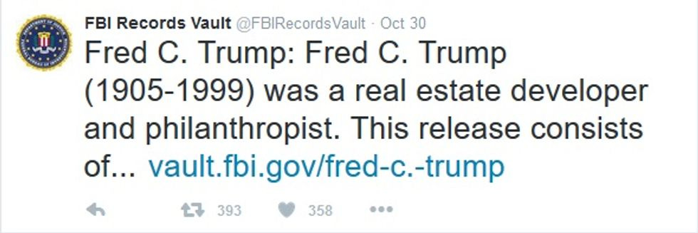As Think Progress, notes, the Twitter account @FBIRecordsVault hadn't posted anything in over a year, and then suddenly, at 4 a.m. on October 30, it suddenly burped out a whole bunch of documents, including such innocuous stuff as the FBI's internal policy on social network use and historical oddities like Nikola Tesla's FBI file. Weirdly, the first of those mostly-routine archived documents was a tweet describing Donald Trump's dead racist daddy as "a real estate developer and philanthropist" -- or perhaps a simple slumlord: