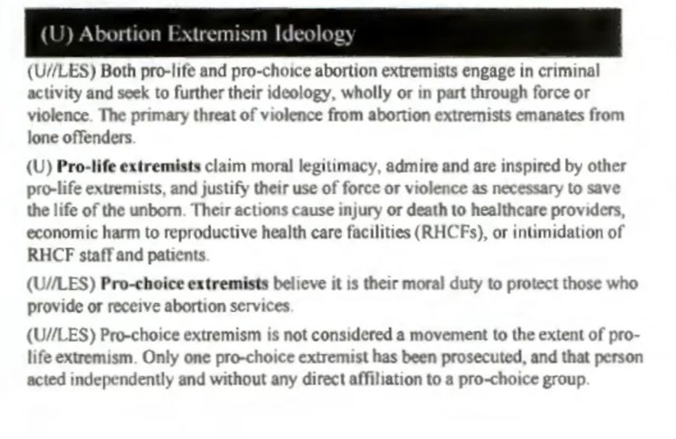 So why did the FBI turn to both-sidesing "abortion extremism" at some point during the Obama administration? The FBI wouldn't say nothing, because it's the fucking FBI: