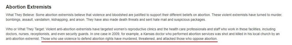 As you might notice, one of those things is not like the others; the document acknowledges "pro-choice extremists" is barely even a real category in the world, with exactly one example. As Jezebel notes, while anti-abortion crazies have bombed clinics and murdered at least 12 people since 1993 (all of them doctors or clinic staff), the "Both Sides" narrative just doesn't work: