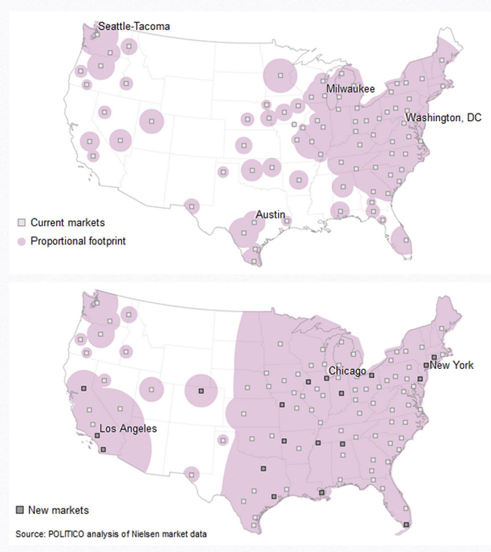 By acquiring 42 stations but pretending some of their audiences are still watching with crappy reception over rabbit ears -- which is not possible given that all broadcasts are now digital -- Sinclair retains broadcast footprint that reaches only "39% of homes." (Allegedly.) Politico made a nice map of what expanding from 38 percent of markets to "39 percent" of markets would look like if the deal is ultimately approved: