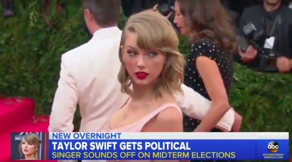 Pop star Taylor Swift disappointed conservatives Sunday by publicly endorsing Democrats and their #MeToo socialism. The right was already reeling from the loss of Willie Nelson (who they never actually had). This just might be too much to endure. Swift, who lives in Tennessee, announced on Instagram that she's voting in the upcoming midterms for Senate candidate Phil Bredesen and House candidate Jim Cooper.
