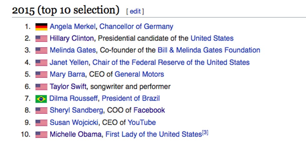 Swift smoked then current first lady Michelle Obama and C-level executives from YouTube and Facebook. The president of Brazil was impeached and removed from office in 2016, so Swift edging her out for sixth place is reasonable in retrospect.