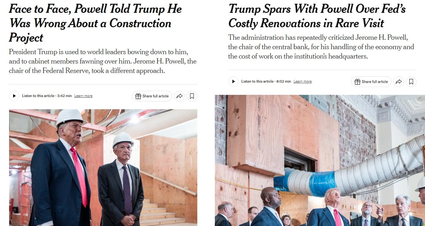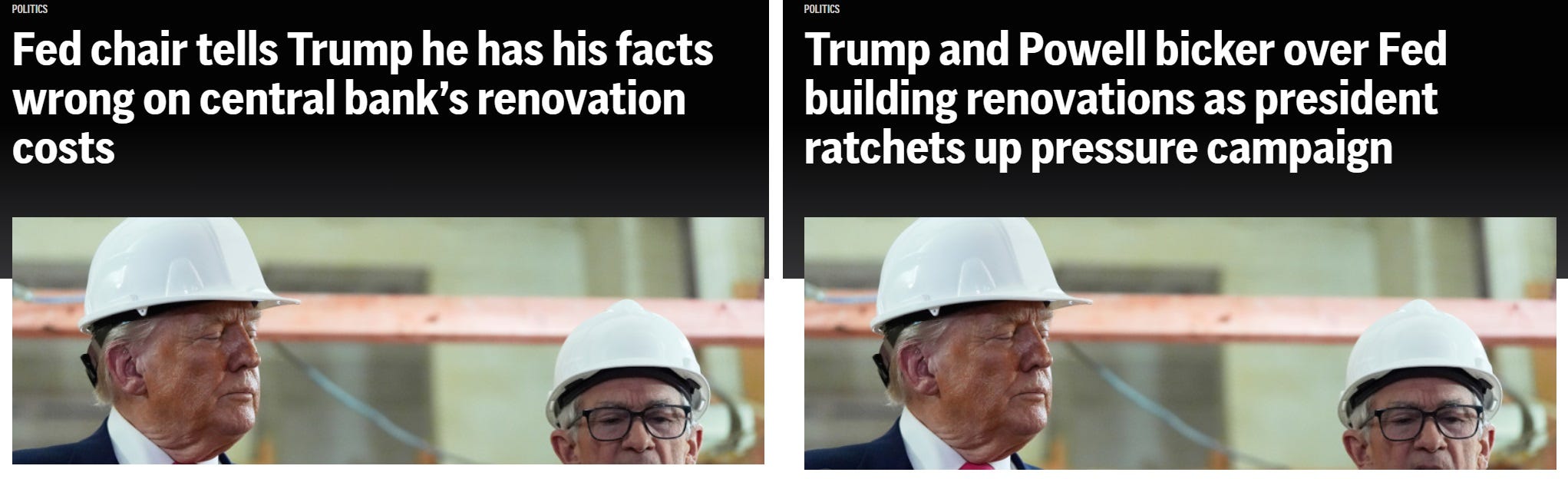 The worst offender we saw was of course Fox, which portrayed Trump as the flawless victor with the headline “Trump tours Federal Reserve, confronts confused Powell about renovation price tag.” It was a video clip only, so no need to even attempt to show that Powell was “confused.”
