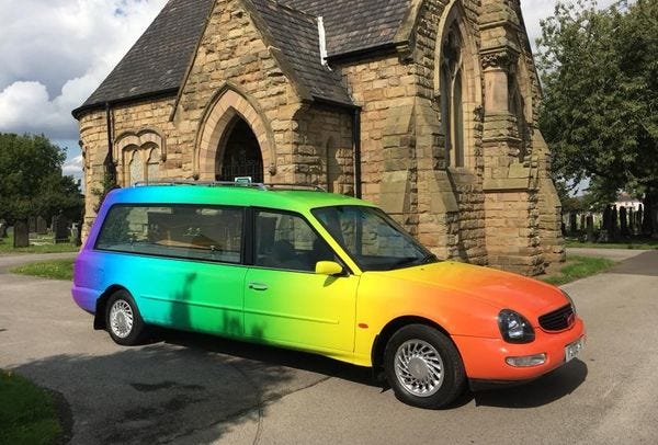 Rainbow hearse remains optional (but it's getting lots of business in England)