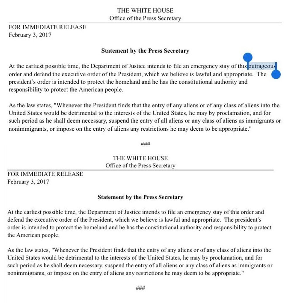 For fans of the revision process, the White House issued a statement saying it intended to ask for a stay of ruling, then shortly afterward issued a second version with the word "outrageous" removed: