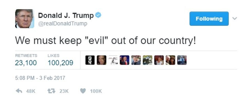 We must also long for a president who had mastered simple punctuation. Still, we could take that TrumpenTwit optimistically: Maybe he'd be willing to accept exile? Get ready for tomorrow's early-morning tweetstorm in which Trump argues Judge Robart is hopelessly biased and unfair because of whatever ethnicity "Robart" is. This executive order can't be illegal because Trump won in an electoral landslide! Can't go after Judge Robart for being an Obama aappointee -- he was appointed to the federal bench by George W. Bush.
