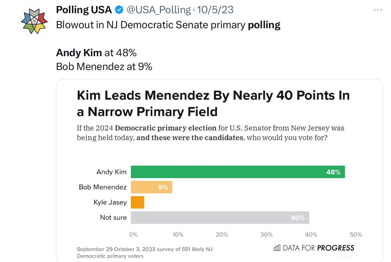 If Menendez resigns to spend more time with his gold bars, New Jersey Gov. Phil Murphy should probably go ahead and appoint Kim to serve the rest of his term and beyond. He’s clearly the people’s choice at this point, though we could end up with a California situation where a few prominent Democrats run for the seat. Menendez is deluding himself if he thinks he can survive a primary. New Jersey Democrats have standards. They aren’t MAGA.