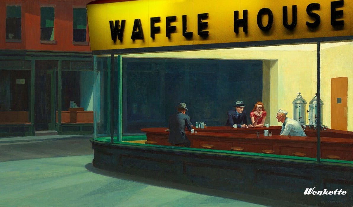 "Newly released internal marketing studies by Waffle House reveal that between midnight and 5:00 AM on any given night, 30% to 60% of customers cannot state with certainty how they arrived, and believe they may have teleported."