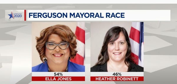 Ella Jones made history in Ferguson, Missouri, Tuesday when she became the first woman and first black person — yes, ever —elected mayor. Jones will replace James Knowles III, who was term-limited out of office. Jones failed to unseat Knowles in 2017 but prevailed against Heather Robinett, who seems like a nice person. Jones also broke barriers in 2015 when she became the first black woman elected to the City Council. Ferguson was founded in 1855 and is no common Portland, Oregon. The city's population is 67 percent black, so the government has had an apartheid flavor for a while. This is an important move forward. It's not just a matter of visible representation but black voters believing that a black politician can actually make a difference in their lives.