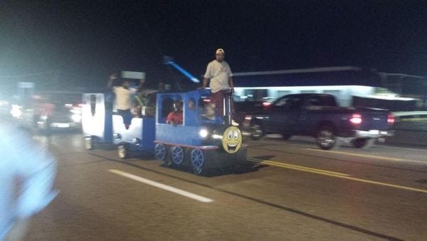 As Snipy noted earlier, the transfer of policing in Ferguson, Missouri, from the local Seal Team Six Wannabes to the Highway Patrol turned last night's turnout into more of a block party, as people celebrated being able to go out in their own streets again without being tear gassed. And one of the stranger entries in the parade was this bizarre kiddie ride pressed into service as a vehicle for protest/celebration. It got a lot of attention, and while Snipy already shared this Vine image in her earlier post, we have to agree it's pretty awesome and worth another look: