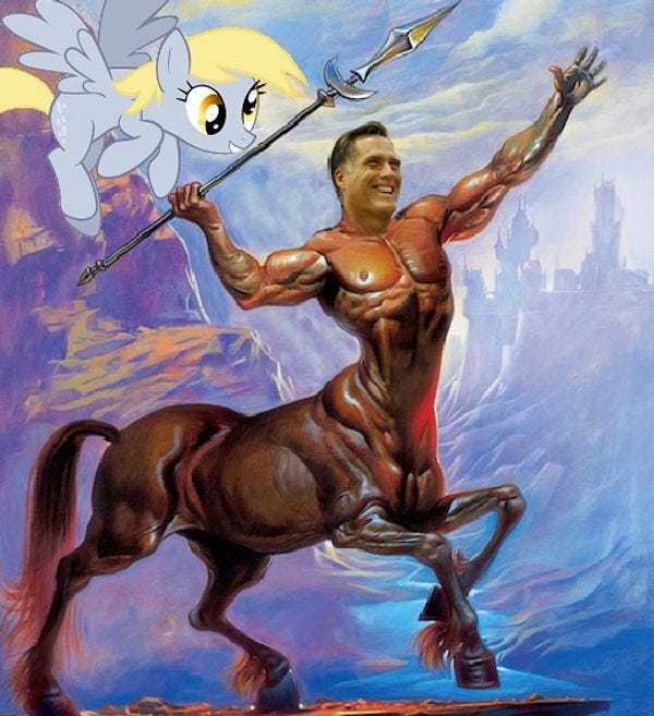 For some reason seeing Mitt as half horse half man makes me think of Ann riding that stallion,"will someone please gouge my eyes out"