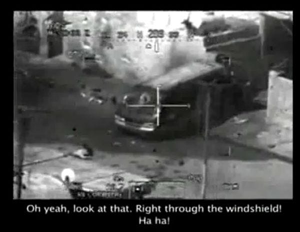 And so while we were trying to find an image of Manning that wasn't from the pay-us-big-monies agencies, we found this still from the very first Wikileak leak, that "Collateral Murder" video, of a helicopter attack in Baghdad: