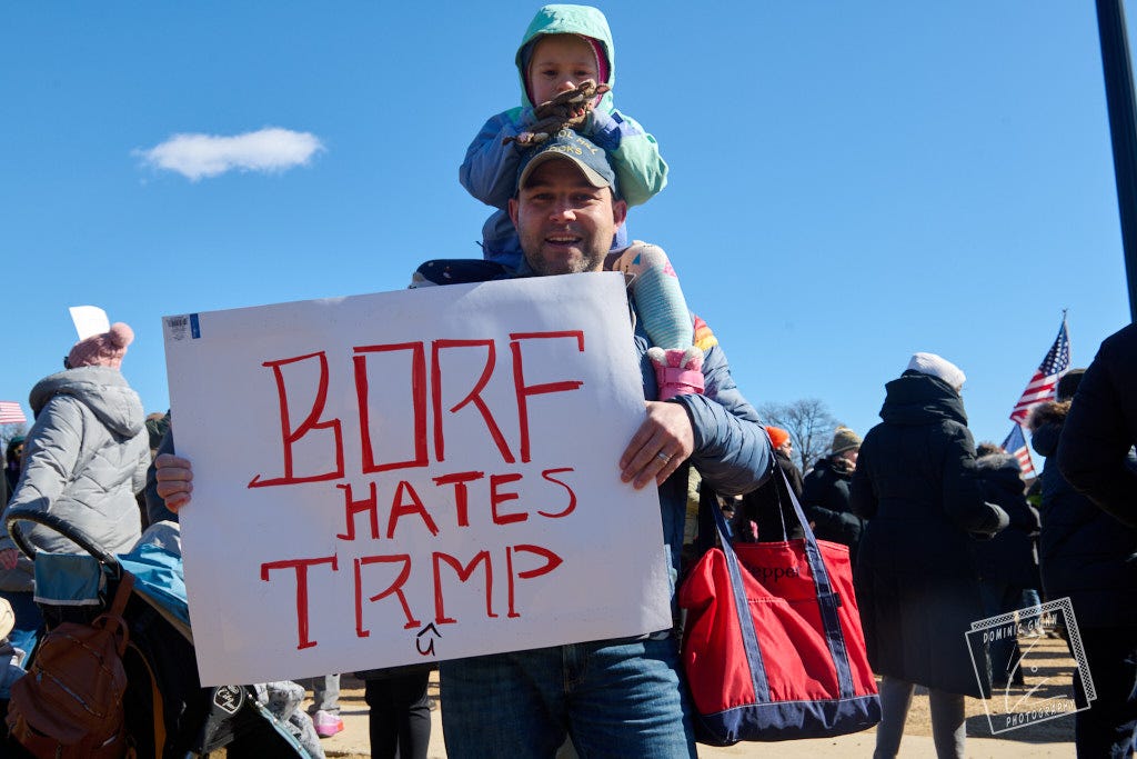 Standing with his child in front of the Capitol, Magee smiled as he flipped his sign to reveal another. “BORF Hates Trump,” it read. BORF was a graffiti artist, and later, a guerrilla art movement against excesses of power and wealth during the administration of George W. Bush, and later, Barack Obama.