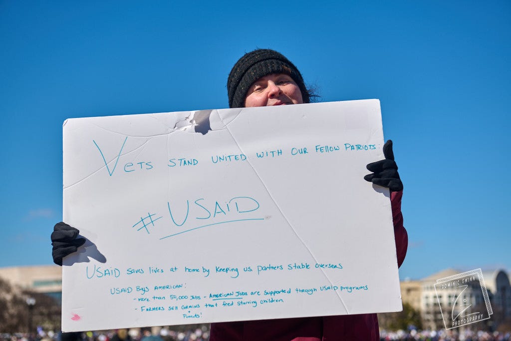 Sara Bernard, 46, of DC, is a retired lieutenant commander in the US Navy. "This is an injustice, what's happening today," Bernard said while holding a sign that read, "Vets stand united with USAID.”