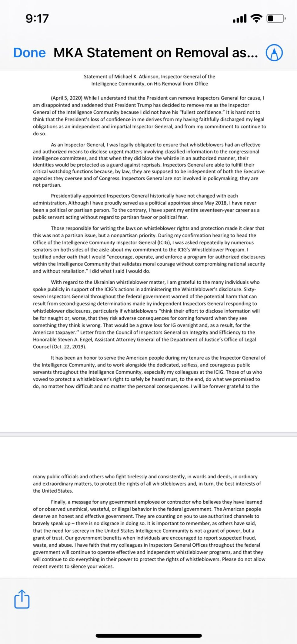 Atkinson gave a fervent defense of our American process for protecting whistleblowers from regimes that just cannot stop committing crimes, defended his lawful handling of the Ukraine whistleblower complaint, and signed off with a message for the other IGs, which kinda boils down to "Yes I am being fired for doing my job, and Donald Trump is trying to intimidate all the other IGs who are witnesses to his crimes. Fuck him."