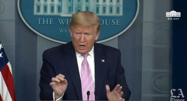 This is what Trump is using his corona-lingus press conferences for these days. Whining and bellyaching about the few remaining competent people in the United States government, both the ones he's fired and the ones he hasn't had a chance to fire yet.