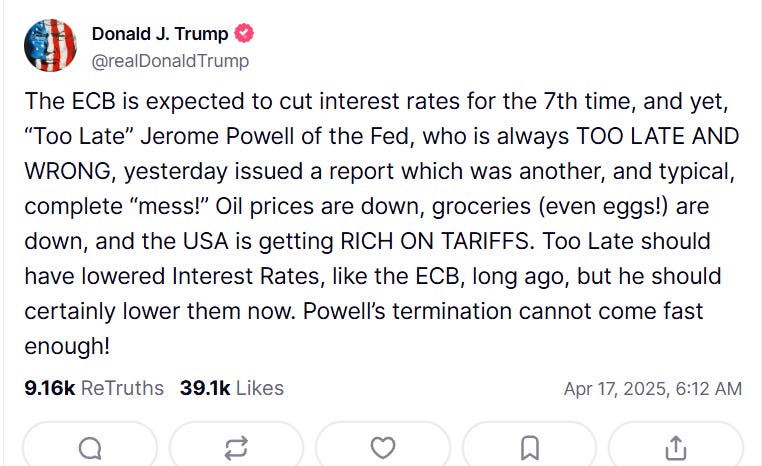 The ECB [European Central Bank] is expected to cut interest rates for the 7th time, and yet, “Too Late” Jerome Powell of the Fed, who is always TOO LATE AND WRONG, yesterday issued a report which was another, and typical, complete “mess!” Oil prices are down, groceries (even eggs!) are down, and the USA is getting RICH ON TARIFFS. Too Late should have lowered Interest Rates, like the ECB, long ago, but he should certainly lower them now. Powell’s termination cannot come fast enough!