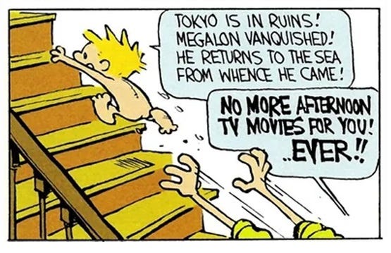 Also, mad respect for Bill Waterson in having Calvin be Megalon, because why would a six-year-old watching whatever was on the Saturday movies know that Gojira was the big star?