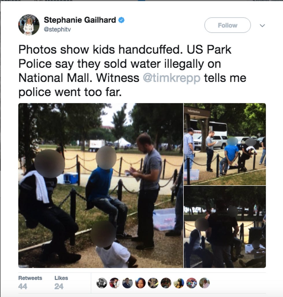 In a related incident over the weekend, three black teens found themselves in handcuffs for "illegally" selling water at the National Mall.