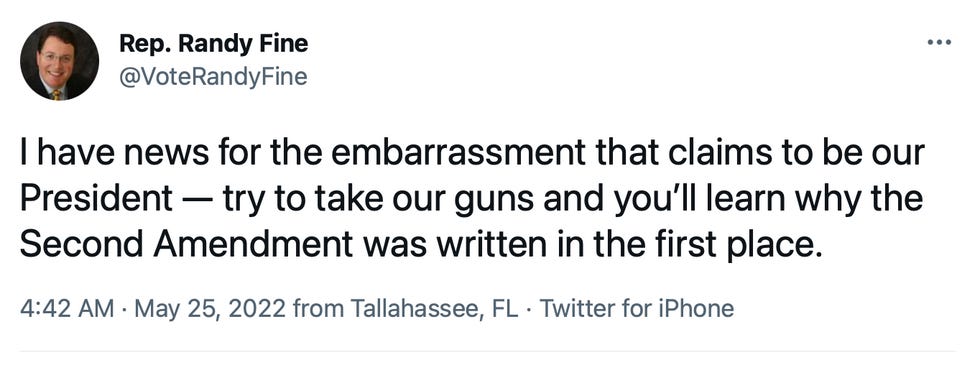 But no, Republicans come out in full, gross force against the meekest calls for gun safety legislation. This morning, Florida state Rep. Randy Fine tweeted: “I have news for the embarrassment that claims to be our President — try to take our guns and you’ll learn why the Second Amendment was written in the first place."
