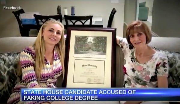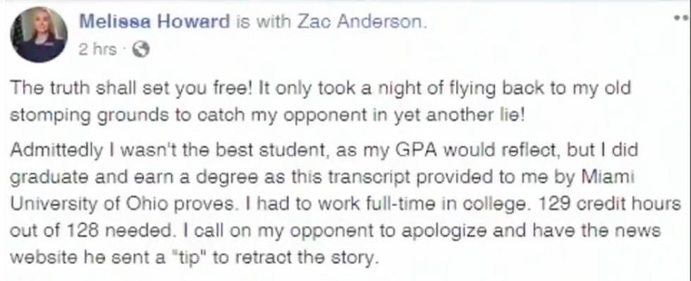 Florida GOP state House candidate Melissa Howard apologized Monday for falsely stating (wait, she's not Donald Trump and this isn't the New York Times , the lady straight-up lied) that she'd graduated from Miami University (the one in Ohio):