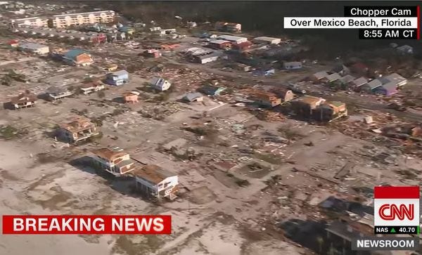 Things in the Florida panhandle are a mess after Hurricane Michael hit Wednesday. About 200,000 people are without electricity, and it could take weeks or months to restore it to all areas, although since Florida voted for Trump, at least it won't take a year, so that's nice. The town of Mexico Beach was virtually wiped out, and Panama City "looks like a bomb has been dropped on it." Four thousand troops from the Florida National Guard have been sent in to clear roads, and 17,000 utility workers are working to restore power. But in the worst-hit areas like Panama City, disaster aid still hadn't made it in by Saturday, according to T he Daily Beast, and FEMA was nowhere to be seen over the weekend. Eighteen people are confirmed dead so far, and the death toll is expected to rise as house-to-house searches continue.