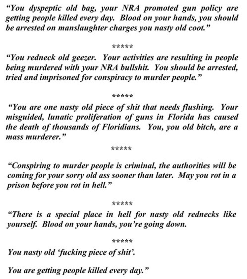 Apparently, to Hammer's mind, a series of five emails sent in the days after the massacre at Marjory Stoneman Douglas High constitutes an actual campaign of harassment, although to some of us, five emails is the minimum involved in getting a goddamned computer delivered to the right address. Still, the excerpts from Leon County Circuit Court documents reproduced by New Times are pretty rough stuff, especially for a nice person who regularly doxes Florida politicians and calls them "traitors" to the Second Amendment. She's clearly a sensitive person. Better send the children out of the room, because this is the sort of thing people sue other people over: