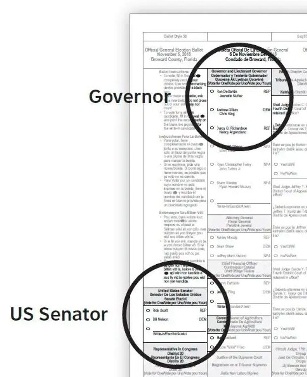 And as with another notoriously badly run Florida election, it appears a badly designed ballot is again responsible for a huge bunch of votes going wrong, this time in Dem-leaning Broward County. Instead of the shittily arranged "butterfly ballot" that caused a whole lot of elderly Dem-inclined Jews in Palm Beach County to "vote for" Pat Buchanan in 2000, this time around, the optical-scanned ballot placed the US Senate race right after the instructions, on the first column of the page, where a small but significant number of voters trying to speed through voting probably missed it, as this meticulous MS-Paint illustration from the Washington Post shows: