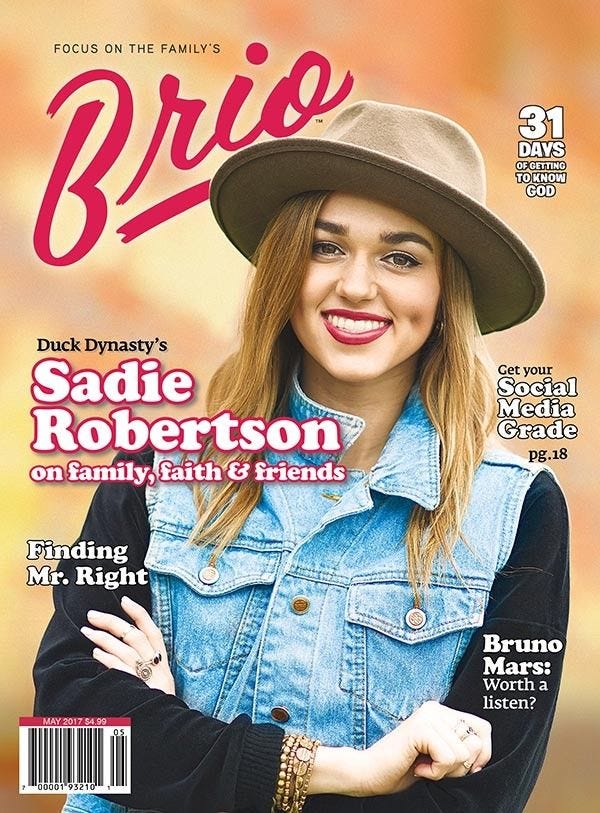 The only celebrities to grace Brio’s cover are those who espouse the Christian worldview of Focus on the Family, like the 19-year-old “Duck Dynasty” star Sadie Robertson, who appears on its May cover and has marketed a line of“daddy-approved” prom dresses.
