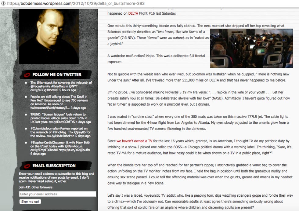 Let’s say I was a jaded, voyeuristic TV addict who, like a peeping tom, digs watching strangers grope and fondle their way to a climax—which I’m obviously not.Can reasonable adults at least agree there’s something seriously wrong about offering that sort of sordid fare on an airplane where children and discerning adults are present?