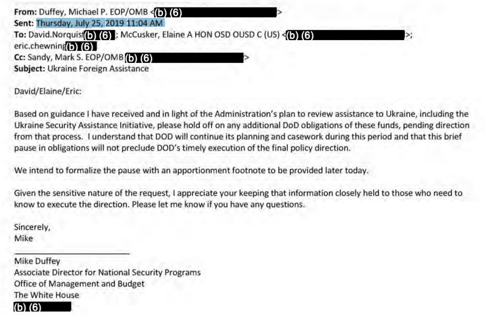 A full ninety-one minutes after Donald Trump hung up from his "perfect, perfect" shakedown phone call with Ukrainian President Volodymyr Zelenskyy, one of Trump's lackeys from the Office of Management and Budget hopped on his Obamaphone to tell the Defense Department not to send any money to Ukraine. Heckuva coincidence, huh? Mike Duffey , as the lackey is known, emailed Deputy DOD Secretary David Norquist to tell him the congressionally allocated $391 million -- $141 million of which was in DOD's piggybank -- was on "pause" for "reasons," and "Given the sensitive nature of the request, I appreciate your keeping that information closely held to those who need to know to execute direction."