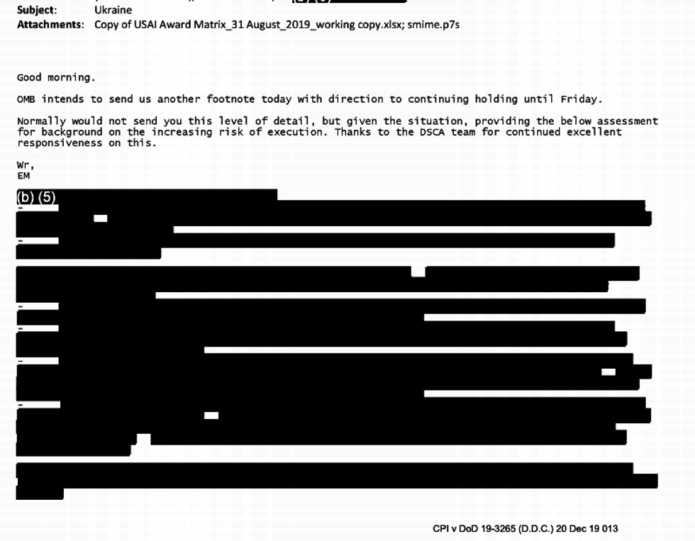 The government has also made liberal use of its black redaction Sharpie, blocking out most of the substantive details under a dubious claim of executive privilege over the deliberative process. Public Integrity is suing to get some of those redactions unblocked, particularly those pertaining to purely factual, non-deliberative matters. For example, this is pretty clearly a fact-based assessment of why Ukraine needs the money and what will happen if they don't get it by the end of the fiscal year, i.e. the allocation will expire and shit will hit the fan when Congress finds out that they all conspired to violate the Impoundment Control Act.