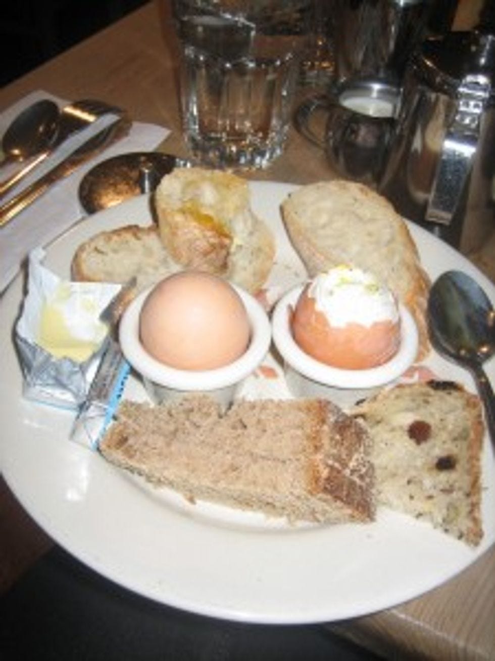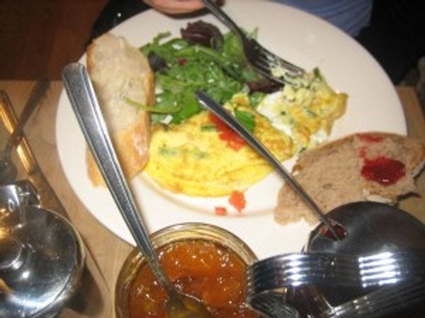 On to the food! The soft-boiled egg plate was such a dream: two eggssurrounded with different kinds of beautiful organic breads, with plenty of chunky apricot and raspberry jam and salty butter for spreading. The omelet was fluffy and had the perfect amount of salty, soft goat cheese and asparagus folded into it.