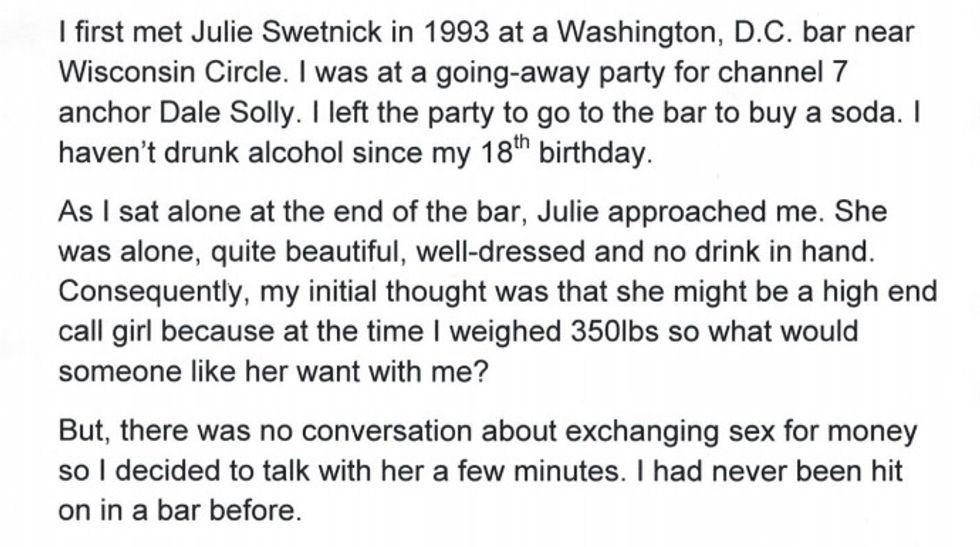 Funny how those excerpts leave out the weirder parts of Ketterer's letter, like his obsessive LDS guilt about having fallen into almost-sin, or this Penthouse Forum-style "I never believed a hot girl would come on to me so I thought she was a hooker" description of meeting Swetnick: