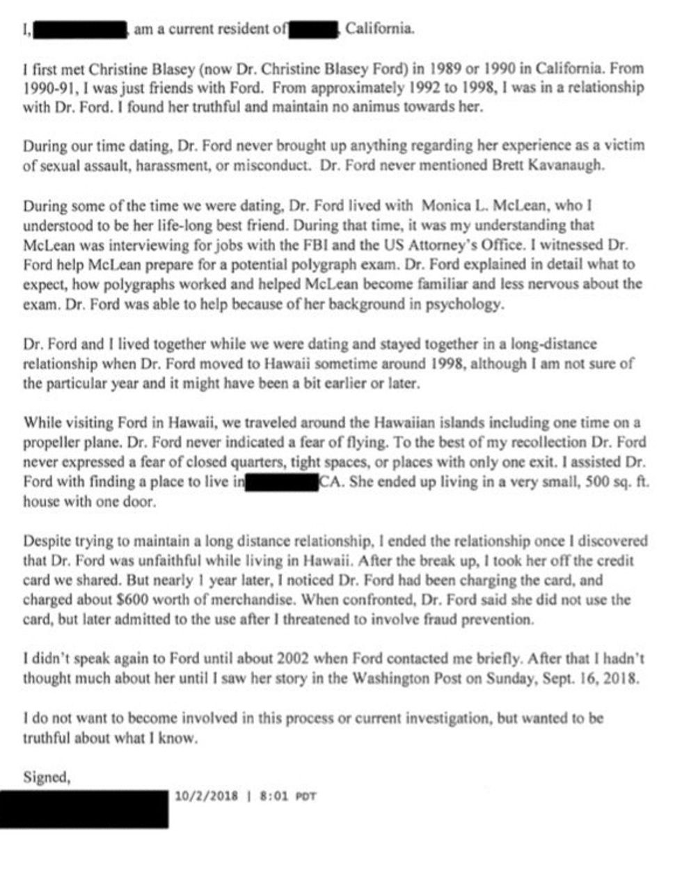 Look, Bart O'Kavanaugh may have lied under oath about drinking and sex and rape, but Blasey told a friend about how polygraphs work (please discuss below whether that constitutes "coaching" or "giving tips/advice") to calm her down, so obviously that was some kind of hypnosis, probably, and she needs to go to jail. Also, she didn't seem afraid of flying or claustrophobic when this guy knew her, so please disregard everything she -- and her husband and counselor -- might say on the matter, because look, we have a letter from a man who says she never mentioned an attempted rape to HIM.