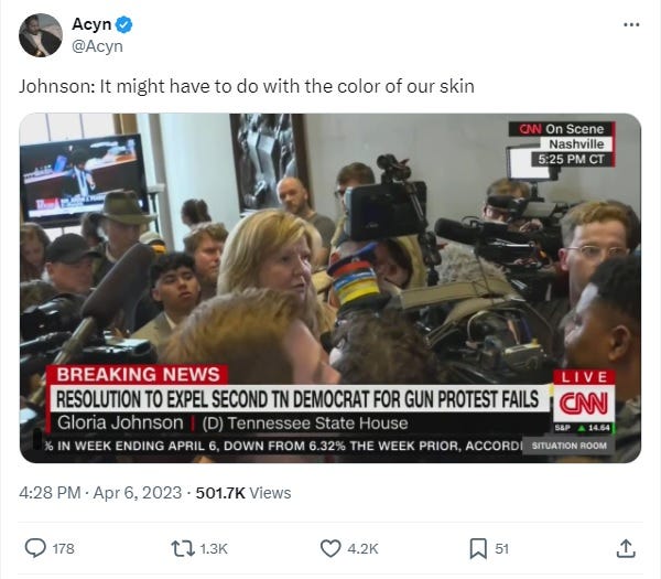 Let's wrap up this too-long review by watching and appreciating Pearson's final statement, where he's joined by members of the Black Caucus for an address that blends the Holy Week message of redemption with the ugly behavior of the Tennessee House, which is crucifying democracy. We imagine his references to Black Jesus must have particularly irked some Republican snowflakes. As a rhetoric guy, I just love Pearson's linking Tennessee to the long dreadful Saturday before Easter: That's where Tennessee is now, hopes crushed, the future unknowable, with only faith — and the strength of Black women — to hold onto while waiting for the Resurrection.