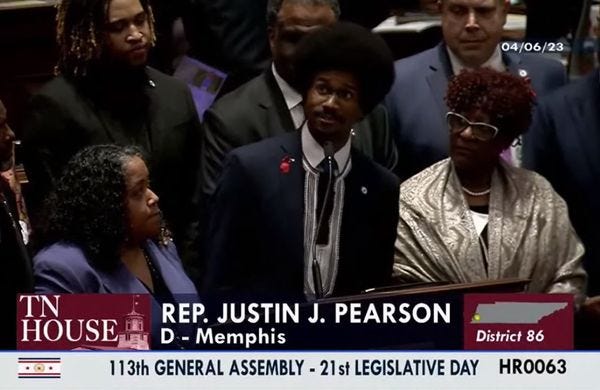 The Republican supermajority that controls the Tennessee House of Representatives got most of what it wanted yesterday : It expelled two of the three Democrats it charged with the unspeakable crime of speaking out of order during a March 30 session, where the three had approached the "well" of the House to show support for hundreds of Nashville teens in the gallery (and thousands more outside) protesting for gun control. But they went to the podium without being recognized , breaking a very important rule and thereby dishonoring and disrupting the House.